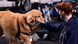 El tierno lomito de raza Golden retriever es más que una apoyo para los participantes de esta disciplina en las olimpiadas