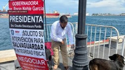 Docente se encadena a poste del malecón e inicia una huelga de hambre, a horas del arribo de Sheinbaum al puerto de Veracruz |