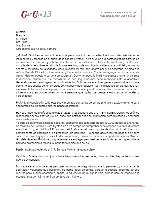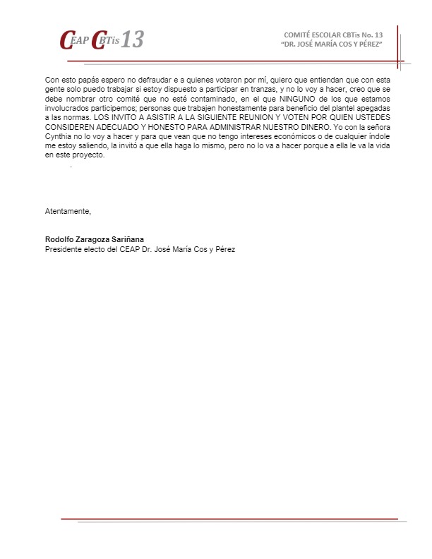 De acuerdo a las normas técnicas que rigen al Comité, legalmente constituido como Asociación Civil, al no haber sido convocada por su presidente, la Asamblea no podía llevarse a cabo, sin embargo se realizó y fue hecha en la vía pública con los riesgos que conlleva, en una afán de Guevara y Filobello por victimizarse, pues la autorización para la utilización de las instalaciones escolares se dio en tiempo y forma. A través de un documento fechado el 24 de abril y distribuido este lunes a los padres de familia, Zaragoza Sariñana explica que el comité al que pertenece nunca fue protocolizado ante notario público, como corresponde legalmente, en su lugar, la tesorera y la secretaria realizaron un acta ante el notario Emeterio López Márquez, en la que el presidente Rodolfo Zaragoza no está incluido, lo que evidencia dolo en su actuar. En el documento de referencia, Zaragoza explica que luego de varias reuniones con ambas personas, buscaban presionarlo y relata que “recibí instrucciones de lo que tenía qué hacer y cómo debía manejar las cosas, me leyeron los compromisos que habían adquirido con el grupo de papás que las apoyaron, enlistaron las promesas y las prioridades”: “La cabeza de la directora Dalia (Pérez) este era el principal objetivo según dijeron”. “Tomar el mando y la administración del CEAP, obvio con sus recursos económicos”. “Quitar los programas de viajes de alumnos a eventos deportivos y culturales”. “Exigir las becas, que faltaron”. “Convertir el CEAP de CBTIS en un CEAP de secundaria, ¿por qué? Por qué quieren cambiar las normas técnicas para rigen al comité”. Debe destacarse que “en ningún punto me dijeron que la finalidad era mejorar las condiciones del plantel para el aprovechamiento óptimo de nuestros hijos”. De forma adicional a este documento, existen grabaciones en audio y video, así como capturas de pantalla de distintos chats en los que se evidencian los verdaderos intereses que mueven a las señoras Cinthya Gabriela Guevara y Brenda Filobello. Rodolfo Zaragoza Sariñana explica que “con esta gente sólo puedo trabajar si estoy dispuesto a participar en tranzas (sic), y no lo voy a hacer” y exhorta ahí mismo a que se nombre otro CEAP “que no esté contaminado”, en el que nadie sea ratificado, sino gente nueva con ganas de trabajar por los alumnos y por el plantel. ![]() ![]() ![]() ![]() ![]() |
