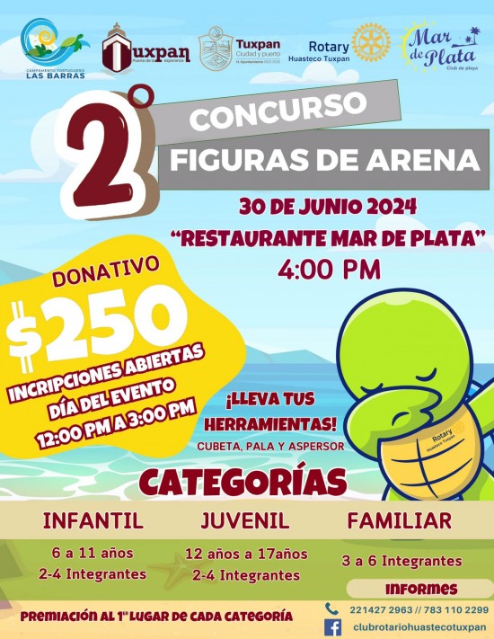 Tuxpan, Ver.- El H. Ayuntamiento de Tuxpan, el Club Rotario Huasteco Tuxpan, el Campamento Tortuguero Las Barras, y el Club de Playa Mar de Plata te invitan al 2º Concurso de Figuras de Arena 2024 que se realizará el próximo domingo 30 de junio a las 4:00 p.m., en el restaurante “Mar de Plata”.