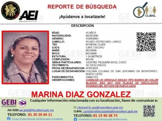 La mujer se fue por voluntad propia de Monterrey y se encontraba en una vivienda de su propiedad. Agregaron que la Fiscalía de Nuevo León solicitó colaboración de las autoridades capitalinas ya que les llegó información que Marina Díaz se encontraba fuera de la entidad. Hasta el momento se desconoce el motivo por el cual la mujer salió de Nuevo León para dirigirse al Estado de México, sin dar aviso a sus familiares. Un detalle adicional es que viajaba a bordo de un automóvil Nissan tipo March color blanco del año 2017 y placas de circulación del estado de Nuevo León. Tras su no localización, madres de familia escribieron comentarios positivos al respecto de la profesora, uno de ellos rescatando su nobleza. |
