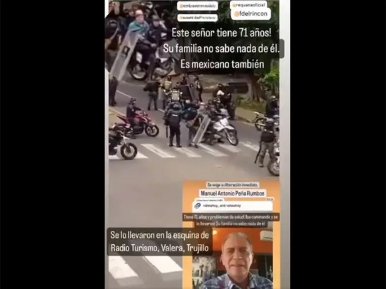 Según las grabaciones, el hombre identificado como Manuel Antonio Peña Rumbos de origen mexicano, de 71 años de edad, con credencial de elector radicada en Nacajuca, Tabasco, fue asegurado por fuerzas policiales cuando se encontraba afuera de una tienda de conveniencia en la esquina de las calles Bolívar y Radio Turismo, provincia de Valera del estado de Trujillo al oeste de Caracas. En el video se observa como es subido a una motocicleta en medio de dos policías y vigilado por al menos otros 20 uniformados. “Son las fuerzas de seguridad del estado que lo agarran disque preso, pero es un secuestro, sin ninguna mediación lo montaron en la moto y se lo llevaron Es una demostración de que el régimen opera de esta manera”, comentó un usuario de apellido Tortolero Figueroa.