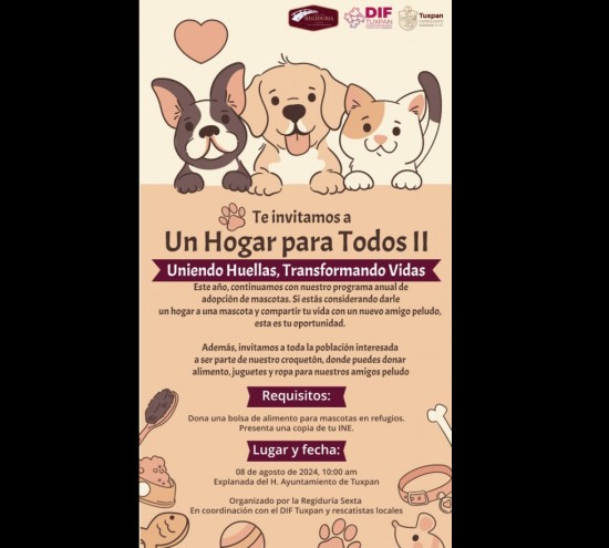 Mañana se realizará la Segunda Jornada de Adopción de Perros, 'Un Hogar para Todos', en la Plaza Cívica de Tuxpan, de 10:00 a 13:00 horas. | ||||||