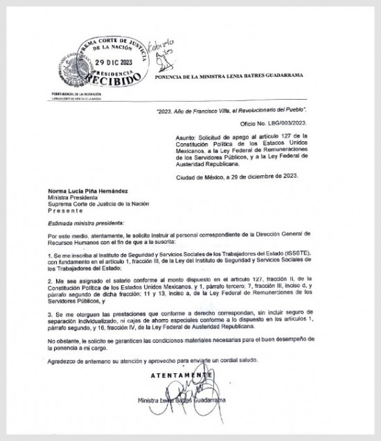 CDMX.- La ministra Lenia Batres Guadarrama anunció este martes que devolvió a la Tesorería de la Federación 416 mil 754 pesos por concepto de la prestación “pago de riesgos" que recibe en la Suprema Corte de Justicia de la Nación (SCJN).