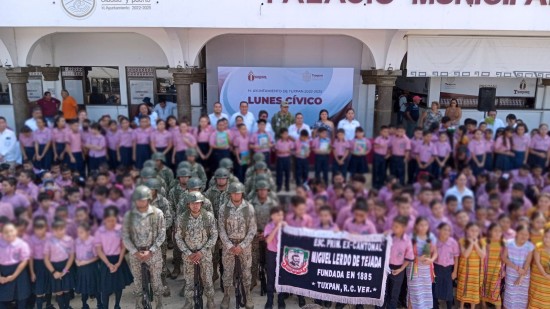 Encabezaron el acto el Prof. Jorge Arturo García Robles, director de Educación, en representación del alcalde José Manuel Pozos Castro; la regidora Maryanela Monroy Flores; el capitán primero de infantería Sergio Palacios Salmerón, de la 19ª Zona Militar; la Lic. Itzel León Santiago, representante de la Delegación Regional de la SEV. La Profa. Marilú de la Cruz Cruz, directora de la primaria Miguel Lerdo de Tejada; el Prof. Eleuterio Samuel Salazar Escalante, supervisor de la Zona Escolar 06; la Lic. Yeni Elizabeth Díaz Quevedo, coordinadora del IVEA Tuxpan. Las y los estudiantes Luciana Elizeth, Jorge Emmanuel, Hannia Sofía, Zuria Michelle, Sofía Nallely y Alia María expusieron las efemérides de esta semana, e Isaac Leonardo presentó una reseña alusiva al inicio del ciclo escolar; mientras que los alumnos de 5º grado realizaron un baile titulado “Flor de Piña”. Durante el evento, la Profa. Marilú de la Cruz Cruz llevó a cabo la entrega simbólica de libros de texto gratuitos. Al finalizar, la Secretaría de la Defensa Nacional realizó la exposición fotográfica "La gran fuerza de México, siempre por ti, siempre por México". También estuvieron presentes docentes y padres de familia de los alumnos; coordinadores y directores de las diversas áreas del Ayuntamiento de Tuxpan; Sección de Fusileros y la Banda de Guerra del 39º Batallón de Infantería; así como elementos de la Policía Municipal, Protección Civil y Bomberos. |