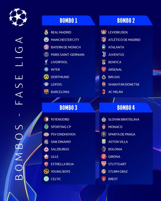 Vale la pena mencionar que los 36 clubes clasificados estarán divididos en cuatro bombos de nueve equipos cada uno, además de que la fase de grupos como la conocíamos a lo largo de 21 años en la Champions League, se eliminará y será sustituida por una nueva ronda de enfrentamientos. LOS CUATRO BOMBOS PARA EL SORTEO DE LA CHAMPIONS LEAGUE Bombo 1: - Real Madrid (España) - Manchester City (Inglaterra) - Bayern Múnich (Alemania) - París Saint-Germain (Francia) - Liverpool (Inglaterra) - Inter de Milán (Italia) - Borussia Dortmund (Alemania) - RB Leipzig (Alemania) - FC Barcelona (España) Bombo 2: - Bayer Leverkusen (Alemania) - Atlético Madrid (España) - Atalanta (Italia) - Juventus (Italia) - Benfica (Portugal) - Arsenal (Inglaterra) - Brujas (Bélgica) - Shakhtar Donetsk (Ucrania) - AC Milán (Italia) Bombo 3: Feyenoord (Países Bajos) Sporting de Lisboa (Portugal) PSV Eindhoven ((Países Bajos) Celtic (Escocia) Young Boys (Suiza) Red Bull Salzburgo (Austria) Dinamo Zagreb (Croacia) Lille (Francia) Estrella Roja (Serbia) Bombo 4: - Slovan Bratislava (Eslovaquia) - Mónaco (Francia) - Sparta Praga (Chequia) - Aston Villa (Inglaterra) - Sturm Graz (Austria) - Bolonia (Italia) - Brest (Francia) - Girona (España) - VfB Stuttgart (Alemania) NUEVO FORMATO DE LA CHAMPIONS LEAGUE La nueva versión de la Champions League contará con 36 equipos, y cada uno de ellos disputará 8 partidos, pero todos estarán juntos, en una liga gigante, y no separados en grupos. Los participantes quedarán divididos en cuatro bombos en el sorteo y los nueve equipos ubicados en el Grupo 1, el de los principales favoritos, se verán las caras con otros dos clubes de cada uno de los otros tres bombos. Los ocho que dominen el ranking al final de esta fase avanzarán a Octavos de Final, mientras que los siguientes dieciseis equipos se enfrentarán en un 'play-off' previo, en el que el vencedor pasará a Octavos de Final y el perdedor quedará eliminado. |