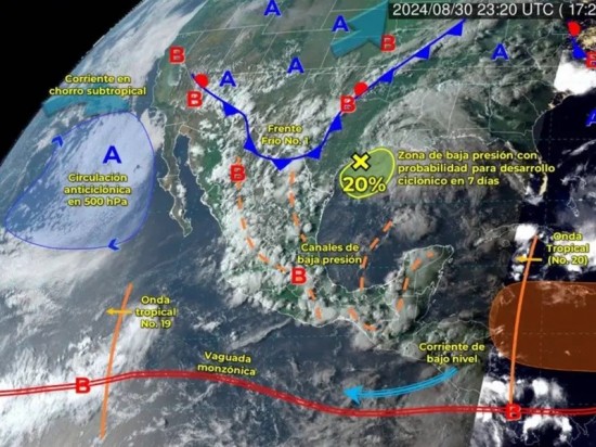 El SMN indicó que para este sábado 31 de agosto, el frente frío 1 interactuará con el monzón mexicano y con un canal de baja presión, originando lluvias muy fuertes en las entidades del noroeste, norte y noreste del país. El clima México hoy 31 de agosto de 2024 prevé fuertes rachas de viento de 60 a 80 km/h y posible formación de torbellinos en Sonora, Chihuahua, Coahuila y Nuevo León. Además, un canal de baja presión, en interacción con inestabilidad en niveles altos de la atmósfera, producirá lluvias intensas en Nayarit, Jalisco, Colima, Michoacán y Guerrero. Finalmente, la onda tropical 20 ingresará a la península de Yucatán e interactuará con un canal de baja presión extendido sobre el sureste mexicano, ocasionando lluvias fuertes a muy fuertes en dichas regiones; pronosticándose lluvias puntuales intensas en Oaxaca y Chiapas. Clima México hoy 31 de agosto de 2024: Temperaturas máximas El SMN indicó que el pronóstico del clima México para este sábado 31 de agosto de 2024 prevé temperaturas máximas de 40 a 45 °C en los estados de: Baja California Sonora Temperaturas máximas de 35 a 40 °C en los estados de: Baja California Sur Sinaloa Nuevo León Tamaulipas Tabasco Campeche Yucatán Temperaturas máximas de 30 a 35 °C en los estados de: Chihuahua Coahuila Durango Zacatecas San Luis Potosí Nayarit Jalisco Colima Michoacán Guerrero Oaxaca Chiapas Veracruz Quintana Roo Clima CDMX hoy 31 de agosto de 2024: Sal con paraguas y chamarra El SMN indicó que el pronóstico del clima CDMX prevé por la mañana cielo medio nublado, ambiente fresco a templado en la región y frío con bancos de niebla en zonas altas. En la CDMX se esperan lluvias por la tarde de este sábado, además de una temperatura mínima de 13 a 15 °C y una máxima de 24 a 26 °C. |