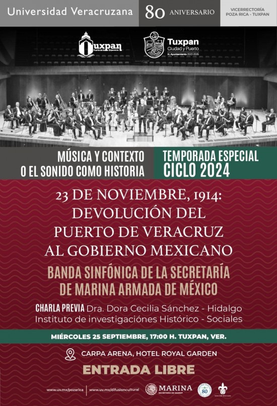 Cabe mencionar que este evento tenía como sede la Plaza Cívica; sin embargo, por los pronósticos de lluvia, se llevará a cabo en la Carpa Arena del Hotel Royal Garden. El alcalde José Manuel Pozos Castro dio a conocer que el concierto será totalmente gratuito e invitó a toda la ciudadanía a la presentación de esta banda sinfónica. El concierto se enmarca en el contexto histórico de la conmemoración del “23 de Noviembre de 1914: Devolución del Puerto de Veracruz al Gobierno de México”. Se tendrá una charla previa de la Dra. Cecilia Sánchez-Hidalgo, del Instituto de Investigaciones Histórico-Sociales de la Universidad Veracruzana. Es importante destacar que esta presentación única es parte del ciclo “Música y Contexto o el Sonido como Historia”, temporada 2024. |