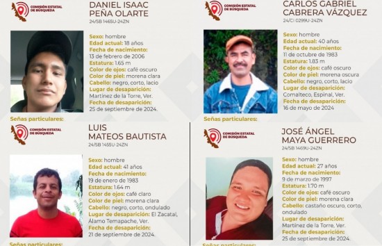 XALAPA.- La Comisión Estatal de Búsqueda de Veracruz (CEB) reportó la desaparición de cinco personas en distintos municipios de la entidad veracruzana y solicitó el apoyo de la población para su pronta localización. Se trata de la ficha 24/SB 1461U-24ZN que reporta la desaparición de Brittany Sherlyn Posadas Díaz, de un año de edad, con quien se perdió el contacto el pasado 11 de agosto de 2024 en El Arenal, municipio de Coxquihui. Por su parte, la ficha 24/SB 1455U-24ZN reporta la desaparición de Luis Mateos Bautista, de 41 años de edad, con quien se perdió el contacto el pasado 21 de septiembre de 2024 en Álamo-Temapache. La ficha 24/CI 0299U-24ZN reporta la desaparición de Carlos Gabriel Cabrera Vázquez, de 40 años de edad, con quien se perdió el contacto el pasado 16 de mayo de 2024 en Comalteco, Espinal. La ficha 24/SB 1465U-24ZN reporta la desaparición de Daniel Isaac Peña Olarte, de 18 años de edad, con quien se perdió el contacto el pasado 25 de septiembre de 2024 en Martínez de la Torre. La ficha 24/SB 1469U-24ZN reporta la desaparición de José Ángel Maya Guerrero, de 27 años de edad, con quien se perdió el contacto el pasado 25 de septiembre de 2024 en Martínez de la Torre.