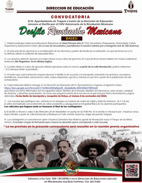 Podrán desfilar alumnas y alumnos de nivel primaria alta (5º y 6º), secundaria, preparatoria y universidades, así como clubes deportivos y asociaciones civiles. El recorrido se realizará a lo largo del bulevar Jesús Reyes Heroles, iniciando a las 9:00 de la mañana en la calle Revolución, y finalizando en la calle Vicente Guerrero (parte baja del Puente Tuxpan). El registro está abierto en la oficina de la Dirección de Educación, ubicada en la calle Adolfo Ruiz Cortines esquina Moctezuma, colonia Del Valle; de lunes a viernes de 9:00 a 15:00 horas, o a través del siguiente enlace: https://docs.google.com/forms/d/1T-fv3NGUDhPqlSpieXE_IjSs0aBeWa-MUD00kClT89Y/edit. La fecha límite de inscripción y recepción de fichas es el viernes 8 de noviembre de 2024. |