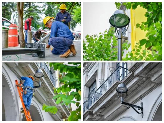 Para brindar una mejor iluminación al Centro Histórico y espacios públicos como la Plaza Lerdo, el Ayuntamiento realiza la instalación de luminarias LED y reflectores. La instalación de las luminarias se lleva a cabo en la calle de Enríquez, entre Revolución y Clavijero. En el área aledaña al Edificio Nachita y Palacio Municipal, además se coloca una línea subterránea en horario nocturno. En la zona del Edificio Nachita se instalan cuatro postes con faroles LED y en Palacio Municipal otros cuatro faroles empotrados en el inmueble. También se están colocando dos postes con faroles LED entre el Callejón de Rojas y Clavijero. Aunado a ello, se cambiaron reflectores en la Plaza Lerdo para mejorar la iluminación en la explanada y la Catedral Metropolitana de Xalapa. Son ocho reflectores de 340 watts. |