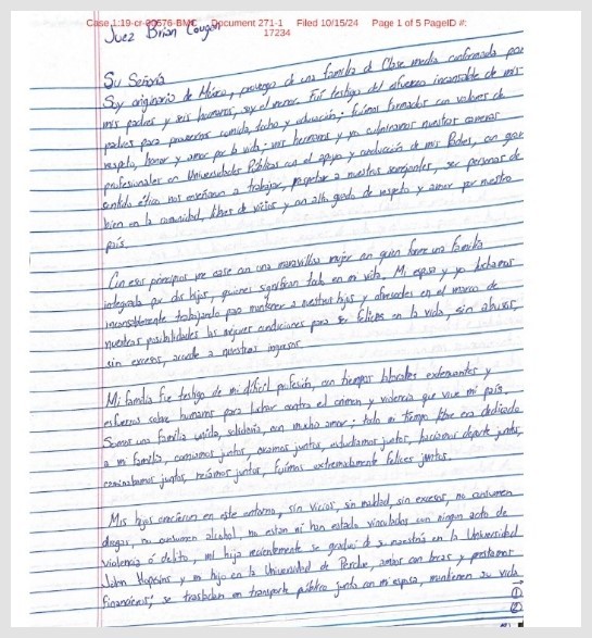 En su misiva al juez Brian Cogan, quien presidió su juicio y dictará su sentencia, habla de cómo fue criado en una familia con gran sentido ético y ser personas de bien con amor por nuestro país | ||||||