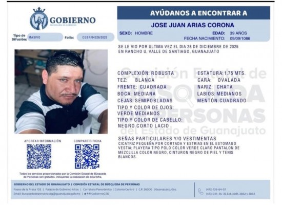 De acuerdo con la información proporcionada, Arias Corona fue visto por última vez alrededor de las 10:40 de la mañana, después de dejar a su esposa en su lugar de trabajo. Desde entonces se desconoce su paradero. De acuerdo con los datos de la ficha de búsqueda de la Fiscalía General del Estado de Guanajuato, José Juan Arias Corona, de 39 años de edad, fue visto por última vez el pasado domingo 28 de diciembre en el Rancho U. El día de su desaparición vestía una playera tipo polo color verde claro y pantalón de mezclilla color negro, cinturón de piel y tenis blancos. Como señas particulares destacan una cicatriz pequeña por una cortada y estrías en el estómago. Su hijo Juanito continúa desaparecido Arias Corona es padre de José Juan Arias Solís, un adolescente de 14 años cuyo paradero se desconoce desde el 19 de junio, tras haber sido víctima de desaparición forzada presuntamente a manos de elementos de la Guardia Nacional y de la Secretaría de la Defensa Nacional (Sedena) en el municipio de Valle de Santiago. Los hechos ocurrieron alrededor de las 11:30 horas en la colonia Rancho Unidos, cuando el menor regresaba a su domicilio y fue interceptado por fuerzas federales, quienes lo llevaron a un terreno baldío donde presuntamente lo golpearon, para después trasladarlo a un sitio desconocido. La Fiscalía General del Estado de Guanajuato inició una investigación por este hecho, mientras que la familia del menor promovió un juicio de amparo por desaparición forzada ante un juez de distrito, siendo el caso turnado al Juzgado Noveno en el municipio de Irapuato. Hasta el momento, ni la Sedena ni la Guardia Nacional han emitido información sobre la desaparición del adolescente. El caso de José Juan Arias Solís fue llevado ante la Organización de las Naciones Unidas (ONU), quien pidió al Gobierno mexicano dar respuestas en este caso y brindar apoyo a la familia, quien la cual también enfrenta una situación de riesgo. |