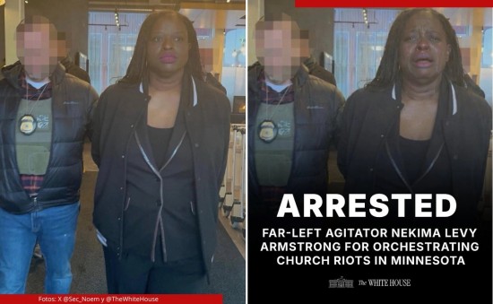 | Este jueves en la mañana, la secretaria de Seguridad Nacional, Kristi Noem, publicó en X una imagen que mostraba el rostro sereno e inexpresivo de Nekima Levy Armstrong, quien fue arrestada junto a otras dos personas por presuntamente perturbar un servicio religioso al protestar contra la ofensiva migratoria del gobierno federal. | ||||||