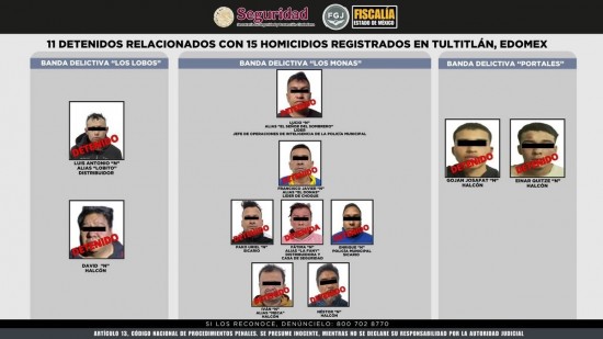 La SSPC informó que los operativos fueron "eesultado de la coordinación con instituciones de seguridad mexiquenses para atender delitos que afectan a la sociedad, se desarrollaron líneas de investigación para identificar a los responsables de varios homicidios en el municipio de Tultitlán".