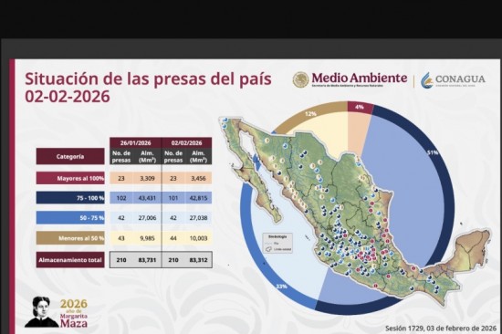A la fecha, el déficit de agua es de dos por ciento con respecto a la media histórica, para estas fechas. En la sesión informativa del Comité Técnico de Operación de Obras Hidráulicas, la Conagua destacó que los embalses tienen un promedio de 67 por ciento de llenado. De acuerdo a la Conagua, actualmente hay 23 presas con más del 100 por ciento de almacenamiento, 101 entre 75 y 100 por ciento, 42 entre 50 y 75 por ciento y 44 con menos del 50 por ciento. Según los datos más recientes de la Comisión Nacional del Agua (Conagua), el total de almacenamiento de las presas en México representa una ligera disminución respecto al nivel histórico promedio, situándose en 67% de llenado general. Es importante señalar que las 23 presas que superan el 100% de su capacidad se concentran principalmente en regiones con alta pluviosidad o con recientes aportes de lluvias significativas, mientras que las 44 presas con menos del 50% se ubican mayormente en zonas áridas o con mayor demanda agrícola. Para ponerlo en perspectiva, los 83 mil 312 millones de metros cúbicos actuales representan aproximadamente 1.9% menos que el promedio histórico para este periodo, lo que indica un déficit leve, aunque no crítico, en el abastecimiento hídrico nacional. La pérdida de mil 99 millones de metros cúbicos en solo 15 días refleja la alta volatilidad en los niveles de almacenamiento debido a factores como el consumo urbano, agrícola y las evaporaciones por clima seco. Según datos históricos de Conagua, el promedio de llenado de presas a inicios de febrero suele rondar entre 68 y 70%, por lo que la situación actual se mantiene dentro del rango habitual. Sin embargo, el monitoreo constante sigue siendo relevante, especialmente para las presas con menos del 50% de llenado, ya que podrían afectar el suministro en regiones críticas si no se presentan lluvias suficientes en las próximas semanas. |